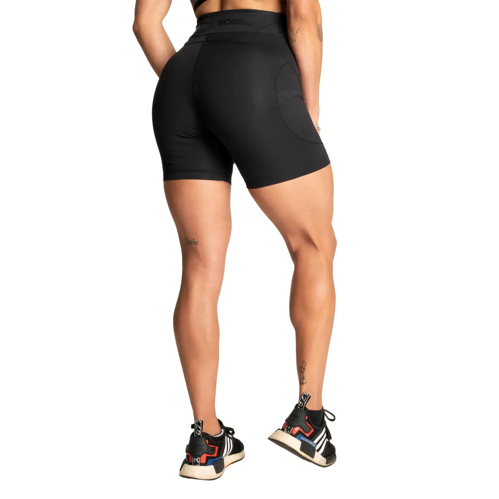 De er laget i et elastisk og mykt kompresjonsmateriale som er fuktavvisende. High Waist Shorts er også utstyrt med en mobiltelefonlomme på siden.