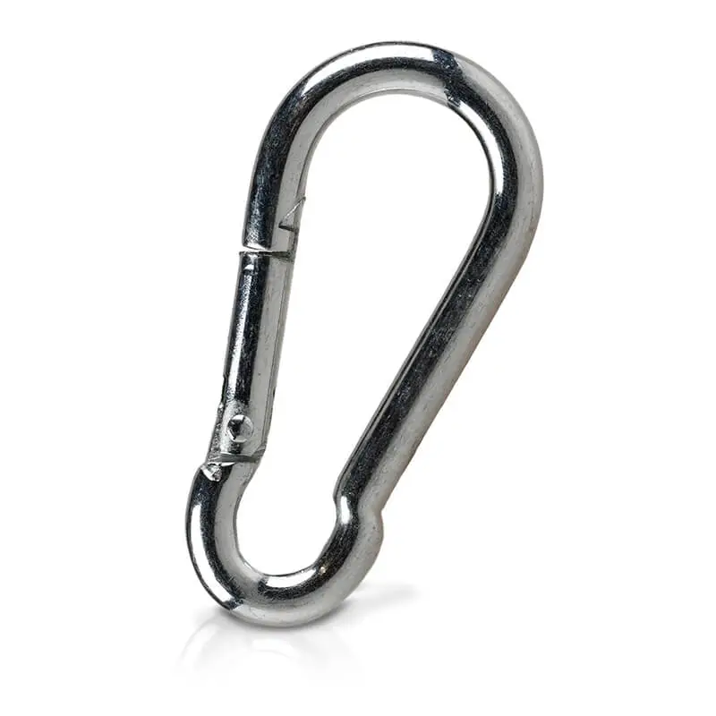 En solid karabinkrok fra C.P. Sports i krom for festing av bl.a. trekkhåndtak i trekkapparater.
