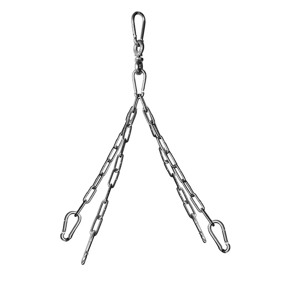 Opphengskjede med svivel til din boksesekk og tilhørende takbrakett som sammen med kraftige karabinkroker brukes til å montere sekken din stabilt i taket.