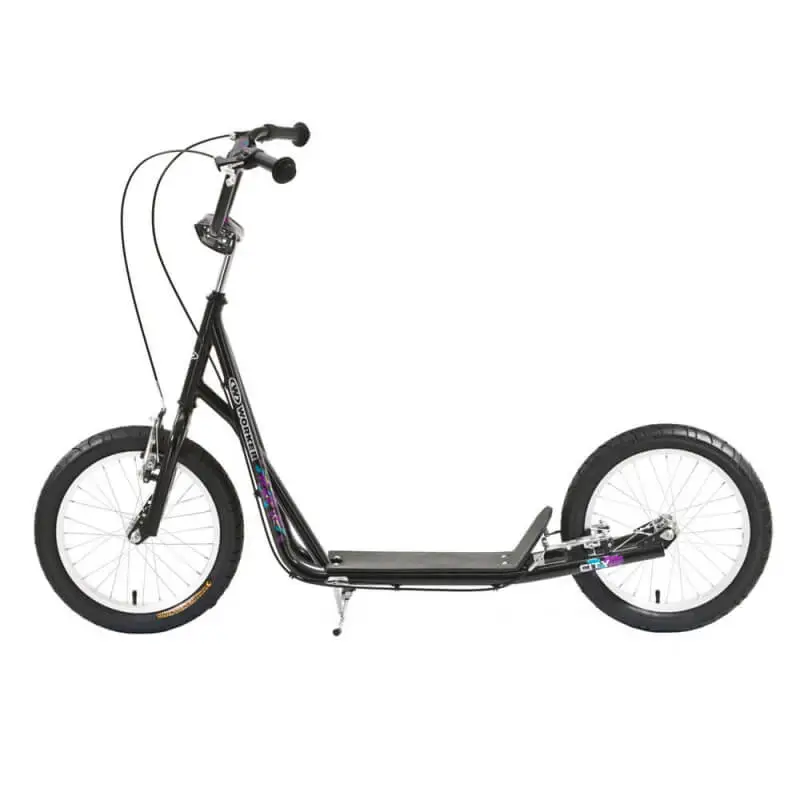 Sparkesykkel fra Worker med pneumatiske 16 tommer hjul som gjør at City har minimal motstand, og den har V-bremser både bak og fremme. Fotplaten er 35 cm, noe som gir mye rom for bena, og styret har en maks-lengde på 110 cm. Vektkapasiteten er opptil 100 kg, som gjør at sykkelen passer til like godt til voksne som til barn. Sykkelen veier 9 kg, og har en totallengde på 145 cm. Styret har en bredde på 60 cm.